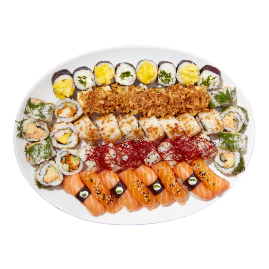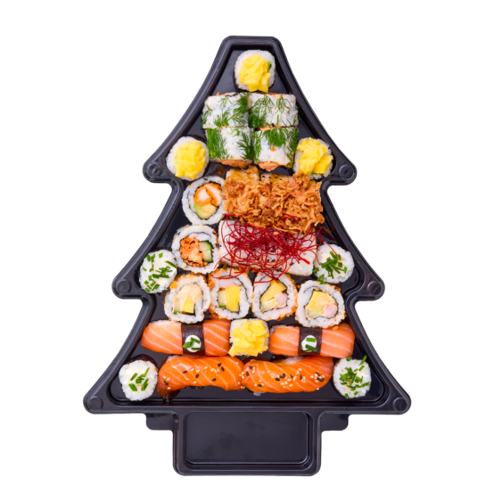 3 sushi saumon mayonnaise aromatisée à la truffe, 2 sushi saumon laqué sésame, 4 california rillettes saumon aneth, 4 california végétarien filament de piment, 4 california mangue crevette cacahuète, 4 maki avocat